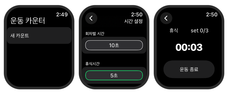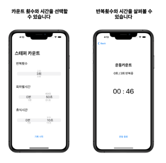 스텝퍼 개수 세기 앱은 사용자가 운동 횟수, 운동 시간 및 휴식 시간을 입력하여 커스텀 운동 경험을 제공합니다. 앱을 시작하면, 사용자는 운동 반복 횟수, 운동 시간, 그리고 휴식 시간을 설