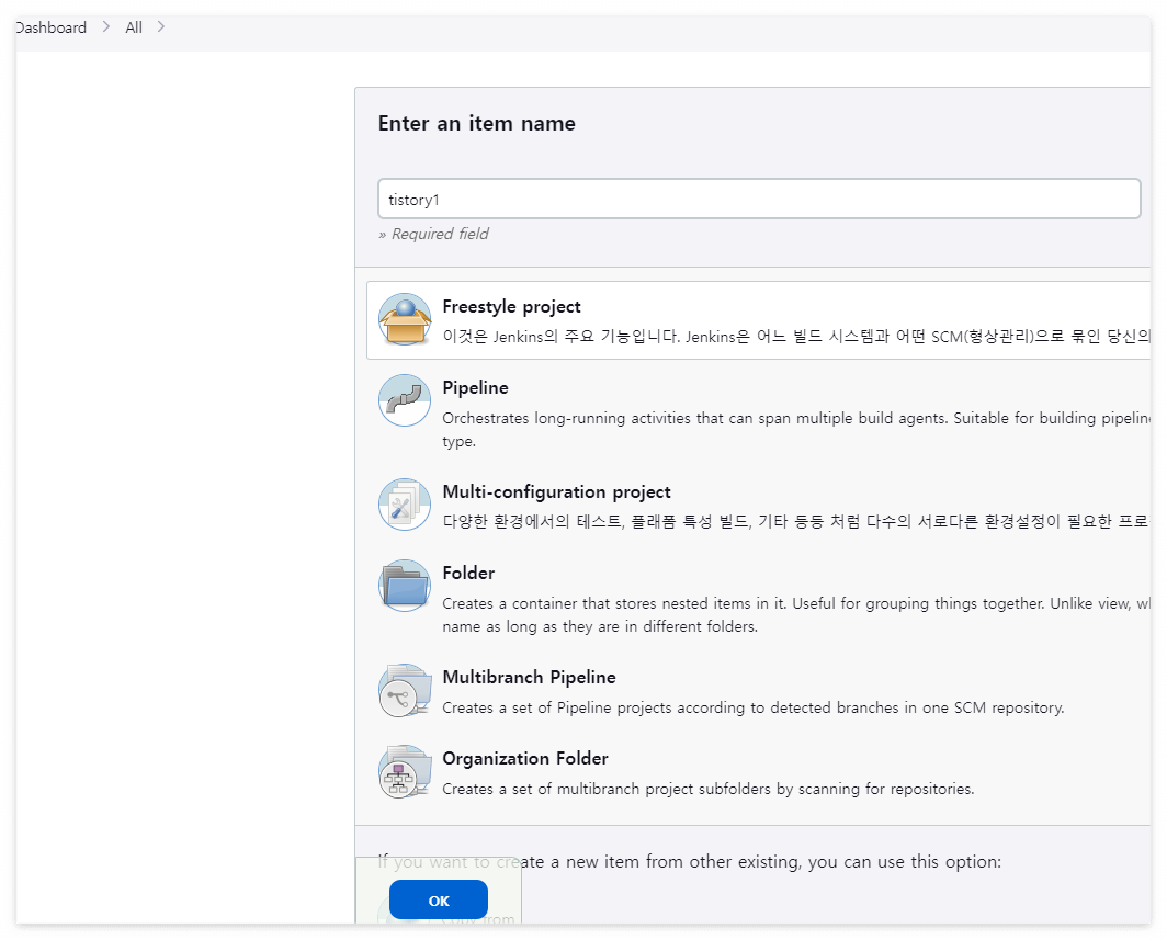 Freestyle project를 설정해주시고 item name을 설정합니다.