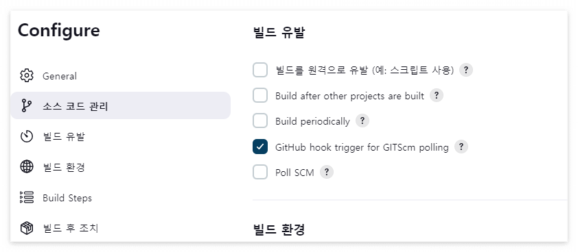 깃허브에서 hook을 보낼때 빌드가 실행되도록 설정을 합니다.